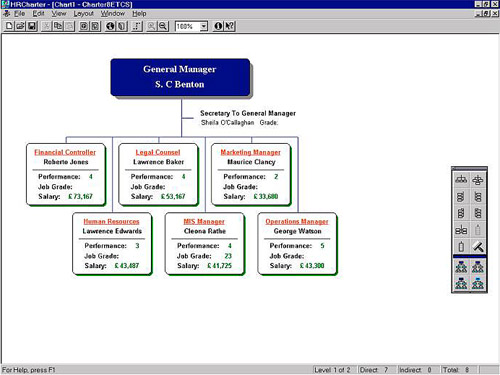HRCharter is a software program that links database technology to traditional organisation charts. It automatically creates wall maps or book charts that depict all or part of your organisation. HRCharter's automatic update capability makes charting a production process - that means you no longer suffer from out-of-date charts.